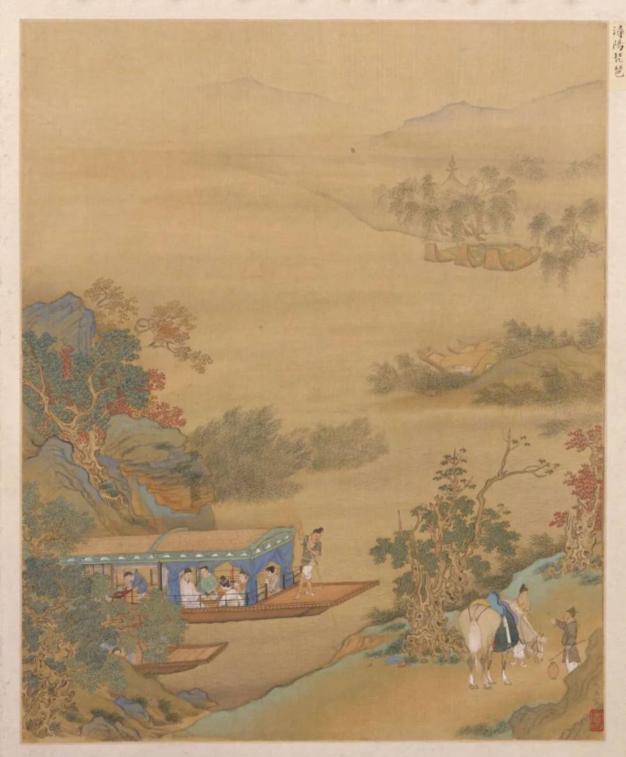 笔法严密,青绿映赭,设色温润。树干多转折,皮理具骨;石面皴擦,泉光渗染。留白开江,实景据岸;人物以铁线勾衣,面庞端宁;车轮朱明,帷幔碧鲜;田埂细划,远村淡写。构图左密右疏,层级井然,气脉贯通。