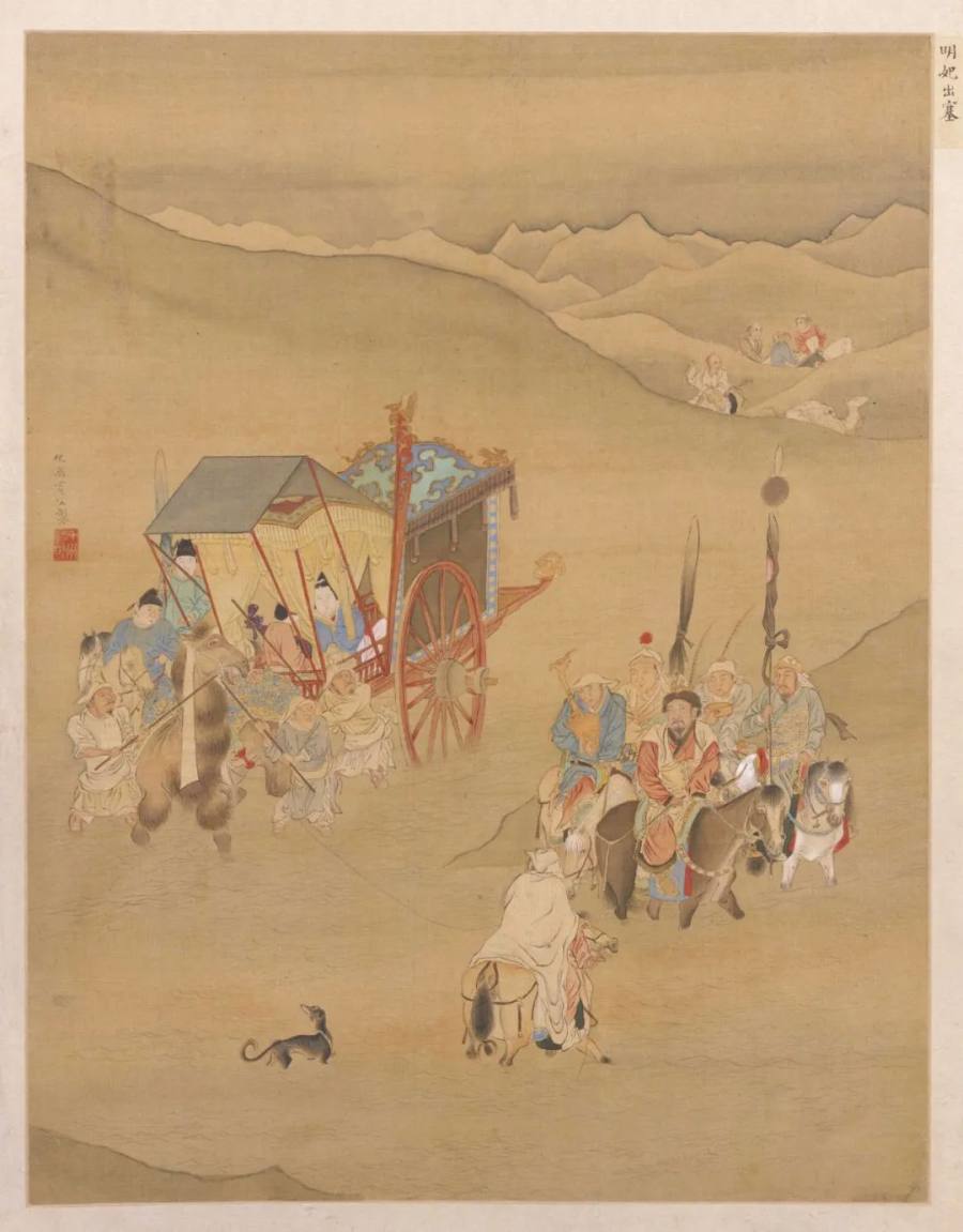 朔风淡黄,沙岭连天。大车朱轮,金钩翠盖,绣幕初启,明妃端坐,手扶帘缦,回眸如月。骆驼前导,弓矢在侧,旌纛高举,缨络生光。近处胡骑并辔,远处氈帐连营;狐猎奔走,麈尘微起。山影如波,天声寂寞,塞草低伏,寒意侵衣。
