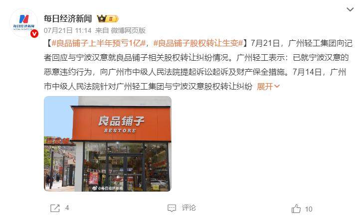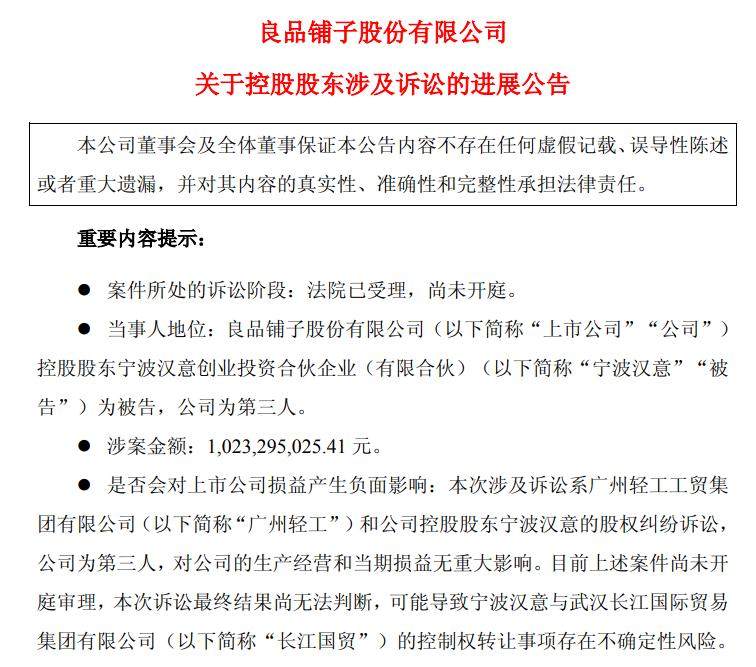 备受关注的良品铺子控制权转让一事有了最新进展。8月14日,良品铺子发布公告,公司控股股东宁波汉意与广州轻工的股权纠纷诉讼,法院已受理,尚未开庭,涉案金额由此前的9.96亿元升至10.23亿元。