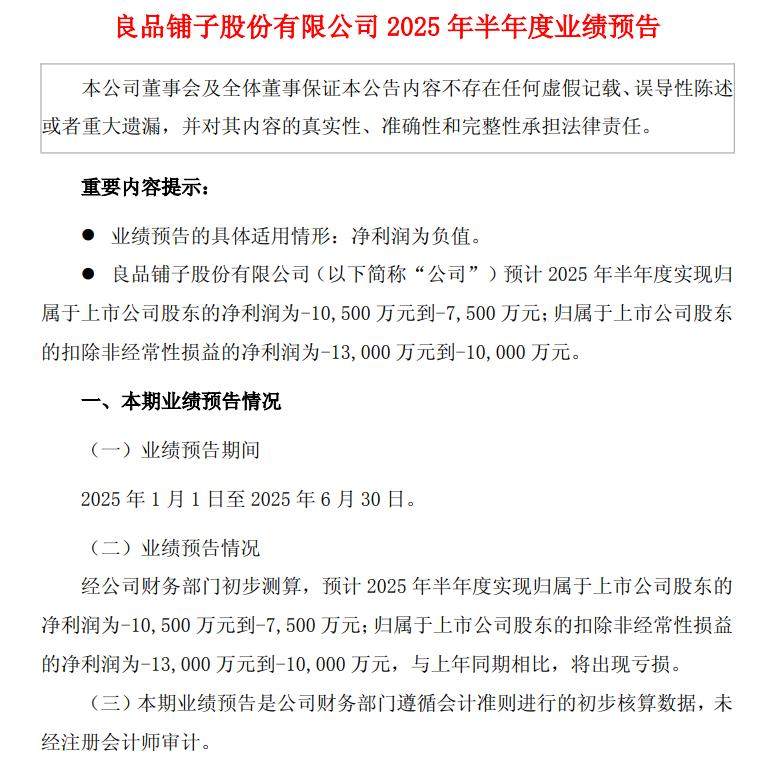 据良品铺子发布的2025年半年度业绩预告,其2025年上半年继续亏损。预计 2025 年半年度实现归属于上市公司股东的净利润为-1.05亿元到-7500 万元;归属于上市公司股东的扣除非经常性损益的净利润为-1.3亿元到-1亿元。而去年同期,其利润总额为5221.43 万元,归属于母公司所有者的净利润为2389.06万元,归属于母公司所有者的扣除非经常性损益的净利润为746.33 万元。