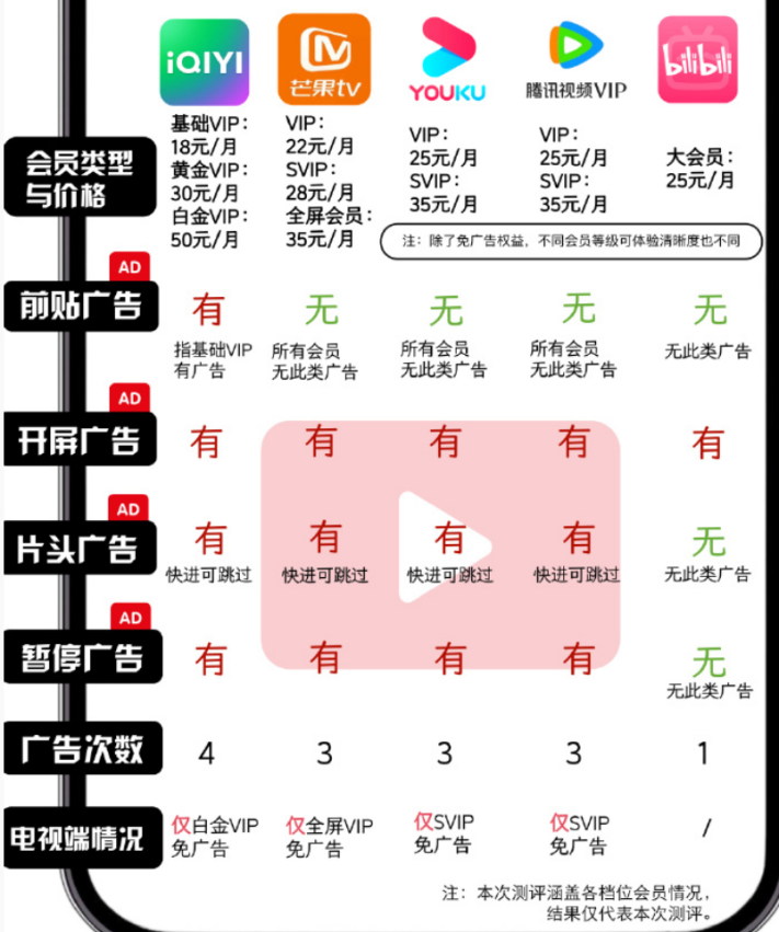 媒体曝五款主流视频平台爱奇艺、芒果TV、优酷、腾讯视频和B站,充会员也难享完全无广告体验