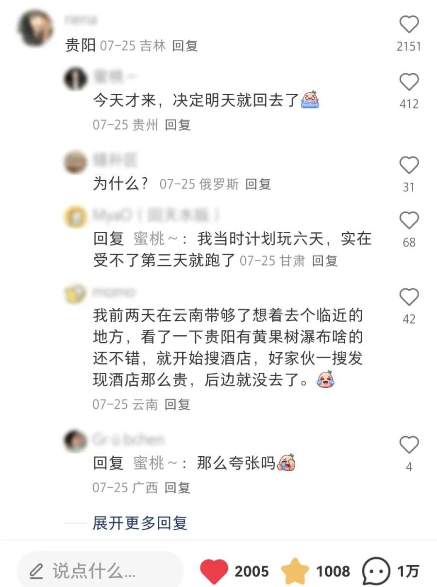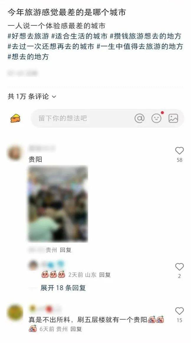 一位小红书博主日前发帖询问:今年旅游感觉最差的是哪个城市?在近万条的评论中,有相当一部分网友提到了贵阳。一位跟帖用户只是回复了“贵阳”俩字,便收到超2000个点赞,并有近400条跟帖。