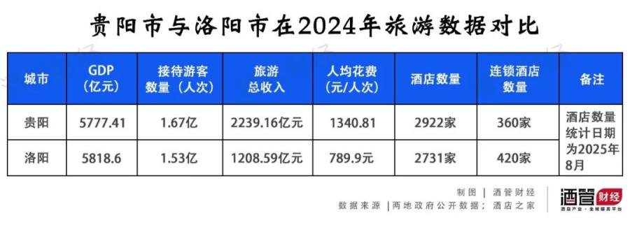 2024年,贵阳市GDP为5777.41亿元,洛阳市为5818.6亿元;贵阳市累计接待国内游客1.67亿人次,旅游总收入2239.16亿元,来贵人均花费1340.81元/人次;洛阳市累计接待游客1.53亿人次,旅游总收入1208.59亿元,来洛人均花费789.9元/人次。
