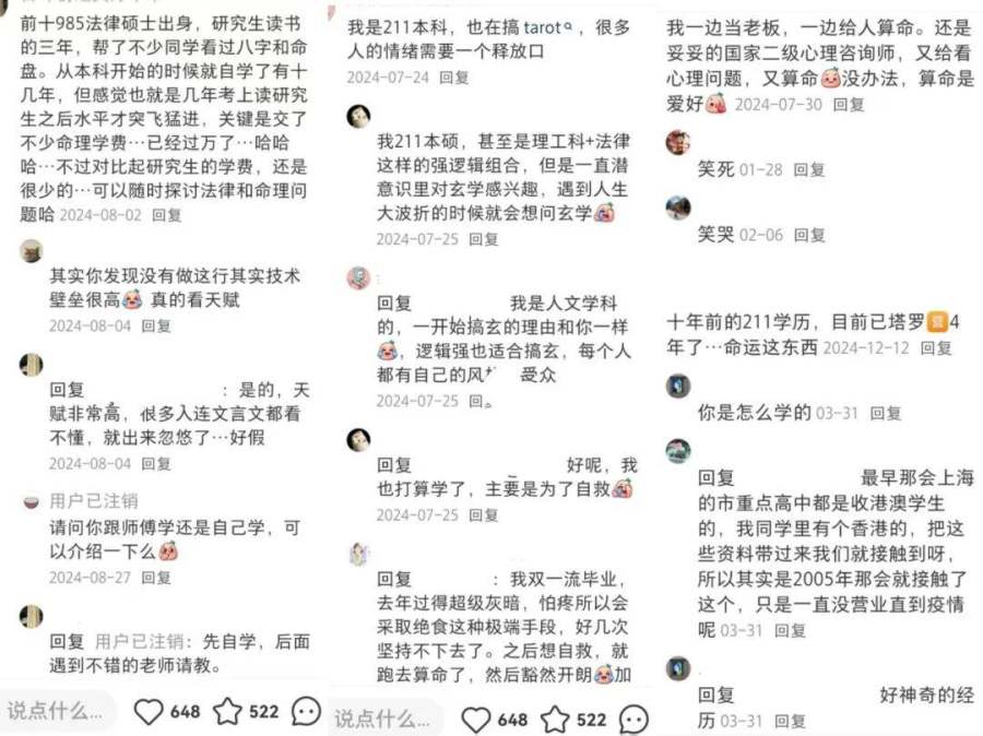 “211学历,目前从事塔罗4年。”“我211本硕,理工科+法律的强逻辑背景,但遇到人生波折就求诸玄学。”“我是985法律硕士出身,自学玄学十几年,命理学费已过万。”