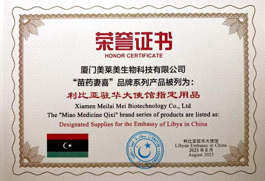2025年8月16日,北京秋高气爽。在利比亚驻华大使馆会客厅里,一场别开生面的"医药外交"正在上演。厦门美莱美生物科技有限公司旗下品牌"苗药妻喜"正式成为利比亚驻华大使馆指定用品,这一授牌仪式不仅是一个商业品牌的荣耀时刻,更成为中利两国文化交流的新典范。