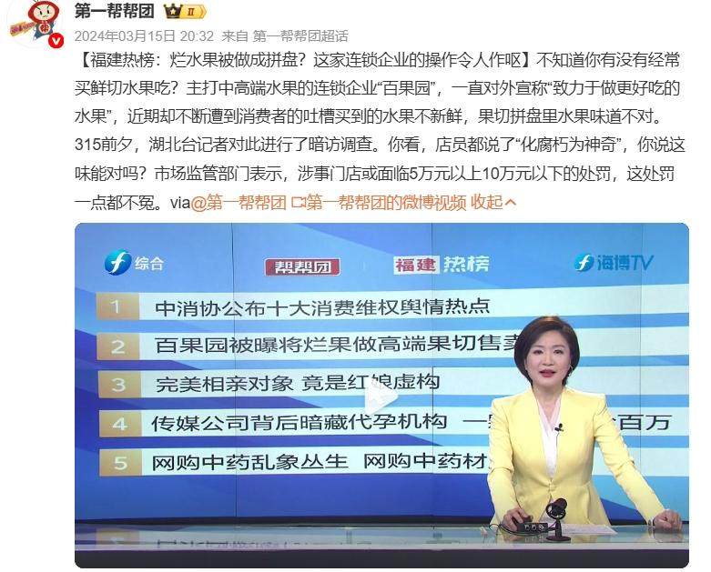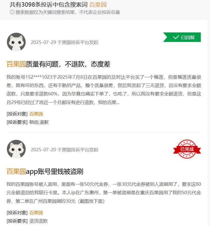 “黑猫投诉”平台显示,包含搜索词“百果园”的相关投诉超3000条,其中大部分都是水果质量及客户服务的问题;近期有消费者投诉表示,“在门店购买荔枝时店员声称新鲜到货,但买回家后打开发现荔枝已严重发霉,当天拿回店内,店员态度恶劣毫无歉意”。