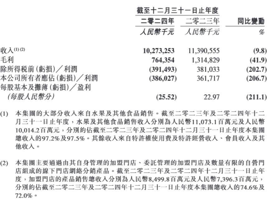 加盟商的经营压力已经传导至百果园的业绩上。2024年百果园加盟店数量从6081家减至5116家,平均每天关店近3家;总收入102.7亿元,同比下跌9.8%,净利润由盈转亏为-3.86亿元。