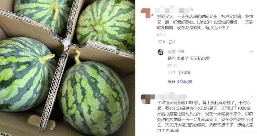 “趣解商业”注意到,如今不止是百果园的加盟商面临高损耗的困境。社媒平台上有不少经营水果店的老板提到,现在卖水果越来越难,“以前一个夏天可以卖七八百斤甚至一千斤西瓜,现在一天只能卖出十来个,处理都卖不出去,天天扔水果扔得心疼。”“每天都处在亏损边缘。”