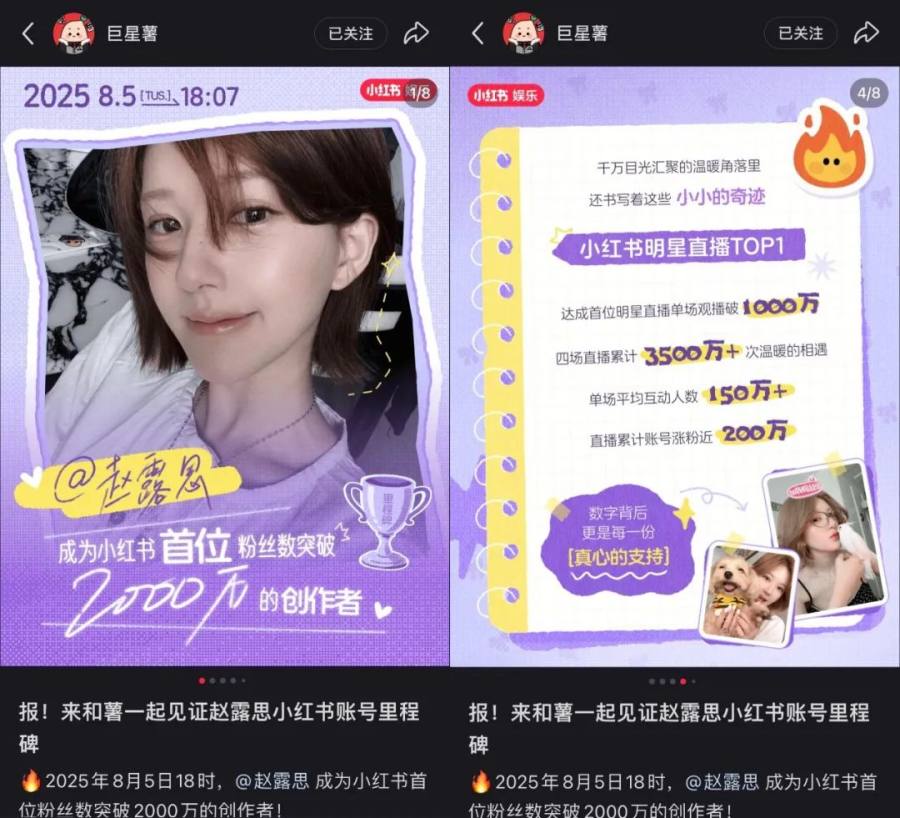 先是各大社交媒体对“赵露思”展现了足够的重视。8月5日,赵露思小红书账号粉丝量突破2000万,小红书明星运营的官方账号“巨星薯”专门发帖祝贺,用一张长图细数了赵露思入驻小红书以来的种种节点。