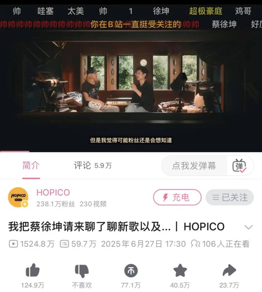 蔡徐坤新歌发布之后的第一个专访在b站发布,播放量达到了1524万,而这位up主日常的视频播放水位在100万上下,直接翻了10倍。这一次,B站拿到了来自粉丝、黑子、路人的集体好评。