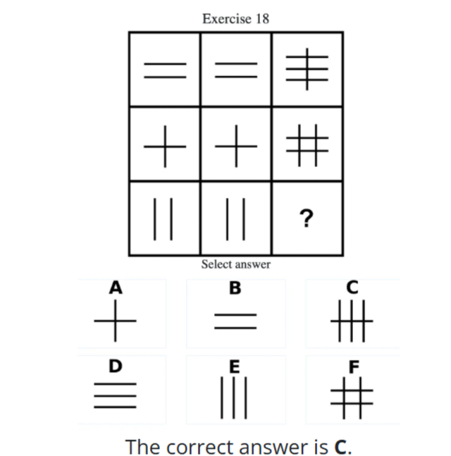 以此题为例,门萨智商测试是由数道图形推理题组成,在第18道测试题中,题目给出了一个3x3的九宫格,其中八个格子已经填上了由不同线条组成的图案,要求AI找出规律,并从六个选项中选择一个正确的图案填入第九个空格。根据规律,右下角的位置应该填C。