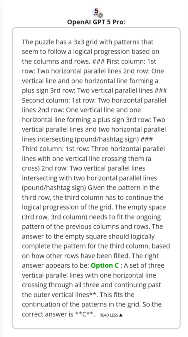 GPT-5 Pro的回答,系统地观察了九宫格中每一行和每一列的图案变化,并指出了其中存在的逻辑递进关系。通过分析已有图案的模式演变,它推断出空格处需要一个什么样的图案才能同时满足横向和纵向的规律。基于这种对整体格局的把握和对细节演变的推断,它最终准确地找到了那个能够补全整个逻辑拼图的正确选项。