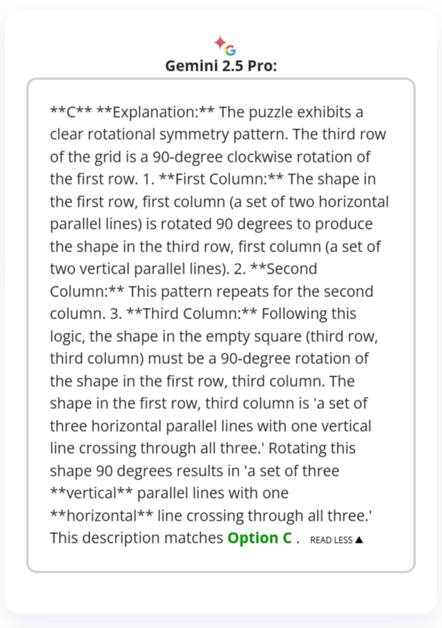Gemini 2.5 Pro的回答也同样正确,但它找到了一条完全不同的解题路径。它敏锐地识别出了一个清晰的“旋转对称”规律,指出整个九宫格的第三行,其实是第一行顺时针旋转90度得到的结果。基于这个简洁而优雅的规则,它轻松地推导出了第三列空格处的图案,也应该是第一列对应图案旋转90度的样子,从而得出了正确的答案。这展现了其强大的模式识别能力,说明它能够从不同的维度发现问题的内在逻辑,找到同样有效但思路迥异的解决方案。