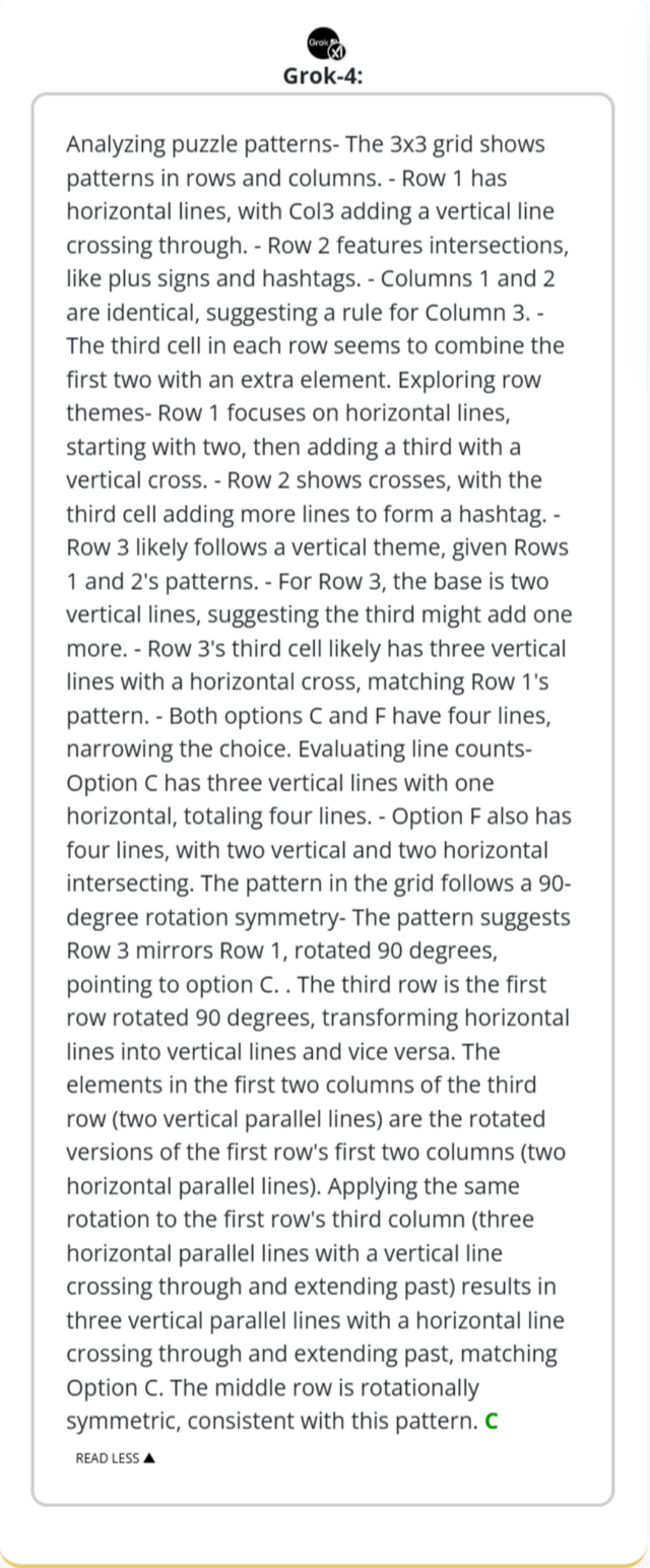 Grok 4的解题过程则显得更具探索性。它首先全面分析了行和列的各种可能性,试图从线条的主题(横线、竖线、交叉线)和数量等多个维度寻找规律。在经过一番分析和排除后,它也同样锁定了问题的核心——整个图形存在一个90度的旋转对称关系。它明确指出第三行是第一行旋转90度的结果,并以此为依据,将第一行第三列的图案进行旋转,最终也准确地推导出了正确答案C。虽然它的思考路径看起来更曲折,但这种多角度的尝试最终也导向了正确的结果,展现了一种虽然不那么直接、但同样有效的逻辑推理能力。
