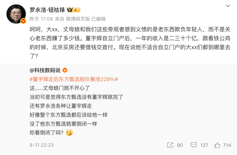 董宇辉的年收入问题再度成为焦点。引爆话题的是罗永浩,他在微博上说董宇辉自立门户后“一年收入二三十个亿”。