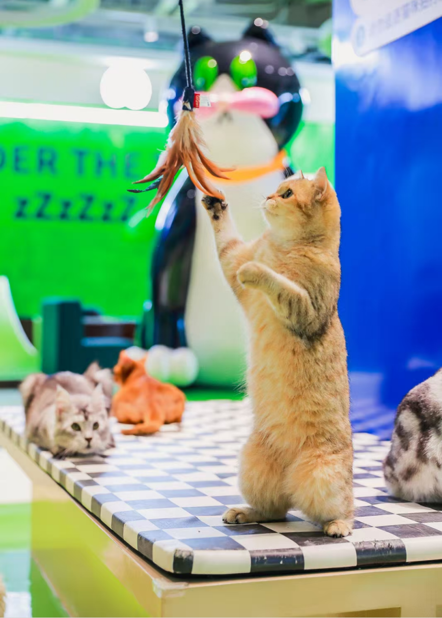 本次展览突破传统宠物互动模式,由国内知名团队设计"青松花园""猫之城堡"等四大主题场景,将猫咪行为艺术与沉浸式体验深度融合。布偶、缅因、德文等稀有品种在绒绒花园的软绵地毯上踱步,与宠物友好饮品区的消费者自然互动;猫咪快报亭则以艺术装置形式呈现猫科知识图谱,让科普成为一场美学实践。"这里既是猫的乐园,也是都市人的情绪疗愈站。"猫空间负责人表示,空间单日最高接待超800人次,印证了现代人对情感消费的旺盛需求。