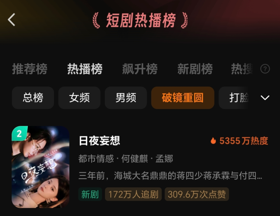 《日夜妄想》改编自小说《日夜妄想》,一共100集。开播四天登上红果热度榜第三名,抖音端原生累计播放量6390w。截止8月17日,该剧累计
