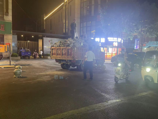 近日,巡防队员苏红刚、张培在欢乐金街中段发现一辆货车在装运建筑垃圾,由于夜间光线昏暗,存在很多安全隐患,巡防队员手持手电筒,在周边来回巡查,不时提醒清运人员 “注意脚下安全”“轻装慢卸减少噪音”。据了解,一门店近期完成室内装修工程,堆积的建筑垃圾如果白天清运,易造成交通拥堵,还可能因扬尘影响街道环境。为此,门店施工方调整清运时间,改为夜间作业。巡防队员在清运现场,认真疏导来往的车辆和行人的安全,维护清运现场秩序;并引导清运车辆安全停靠,提醒清运人员清运,装车堆放作业时注意安全,尽量降低噪音。