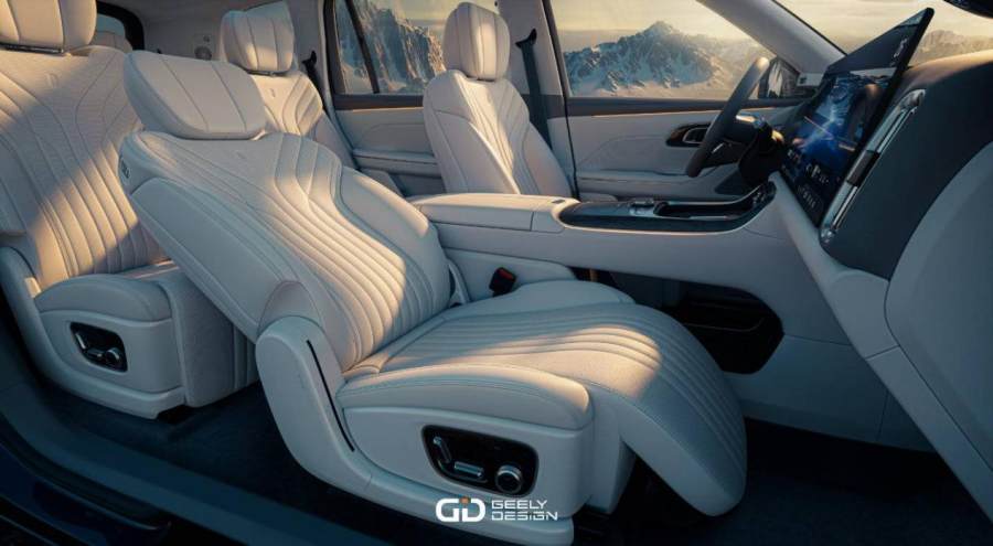 三进 · 从容自在:彻底告别传统SUV三排小板凳的窘迫。150°同级唯一躺倒角度、1070mm超宽坐垫、970mm头部空间,以及0.15㎡的勃朗峰舷窗采光,带来前所未有的舒适。石墨烯加热与独立充电口等细节,尽显人性化考量。