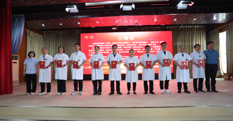 会上,张宾副院长宣读表彰决定,院领导为获奖人员颁奖。体格检查比赛中,内分泌肾病风湿科郭晶晶获一等奖,儿科耿晓丹等3人获二等奖,脑病一病区王少锋等4人获三等奖;三级医师查房团体奖中,妇产科团队摘得一等奖,肛肠科及脑病一、二病区团队获二等奖,消化内科等团队获三等奖。此外,“最佳责任护士”“最佳住院医师”等个人奖项同步揭晓。