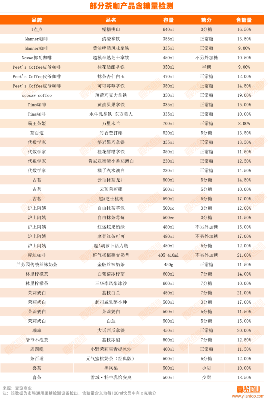 此前,茶咖观察评测过超60款茶饮、咖啡,即便非全糖茶饮,平均含糖量也在12%左右(每100ml饮品含12g糖)。同时,不少品牌依旧依赖植脂末、代糖、调制乳中和口感,而相关的原料成分并不透明,消费者陷入“好喝不敢喝”困境。