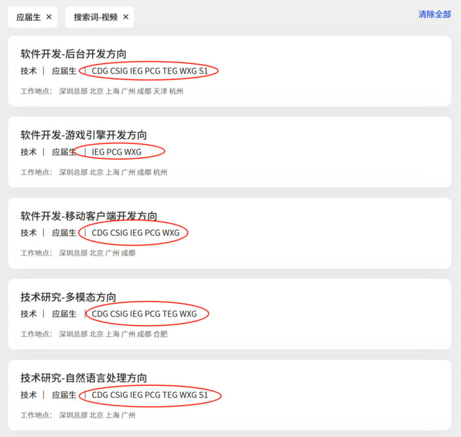292个应届、实习及青云计划岗位中,有60个岗位命中“视频”关键字,但是点进去看之后,我们只能找到8个岗位可能与腾讯视频业务相关,比如“(文学策划类和短视频直播动漫类)内容策划”等。