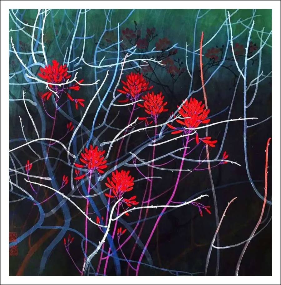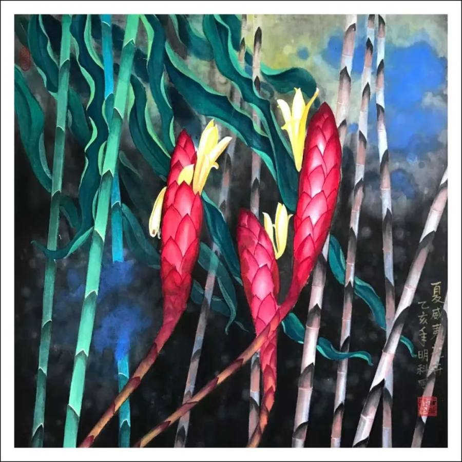 色彩问题,在传统写意画中向来都是较为棘手。但在今日王明科先生的众幅画作中,我们却是能看到他对色彩的完美把控和运用处理。一方面他是集各家之所长,将工写技法兼容于一身,并在一定程度上参考了西方色彩,使之与中国的传统工写文化相结合!另一方面,他更是深知色彩的局限性,一旦滥用,则势必会对整幅画面形成难以言表的取象破坏,以至于满纸炫烂落于俗套。所以在创作过程中,王明科先生总是能巧妙地运用工写技法的对比性来区分色彩关系,使作品既展现出了随类赋彩的精确性,同时又赋予了色彩晕染流动的幻化感。通过这样的艺术处理,画中自然而然就形成了极其丰富的层次感和细腻的质地感,更是真正实现了“致广大而尽精微”的艺术境界!