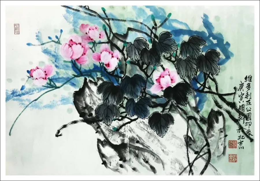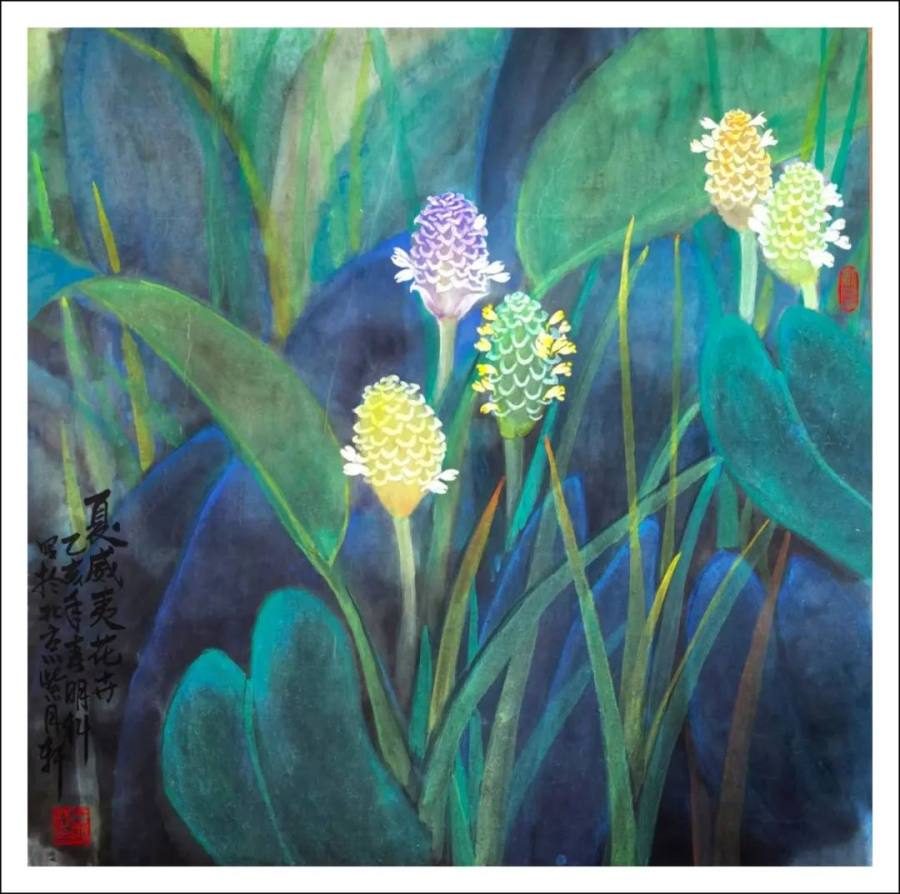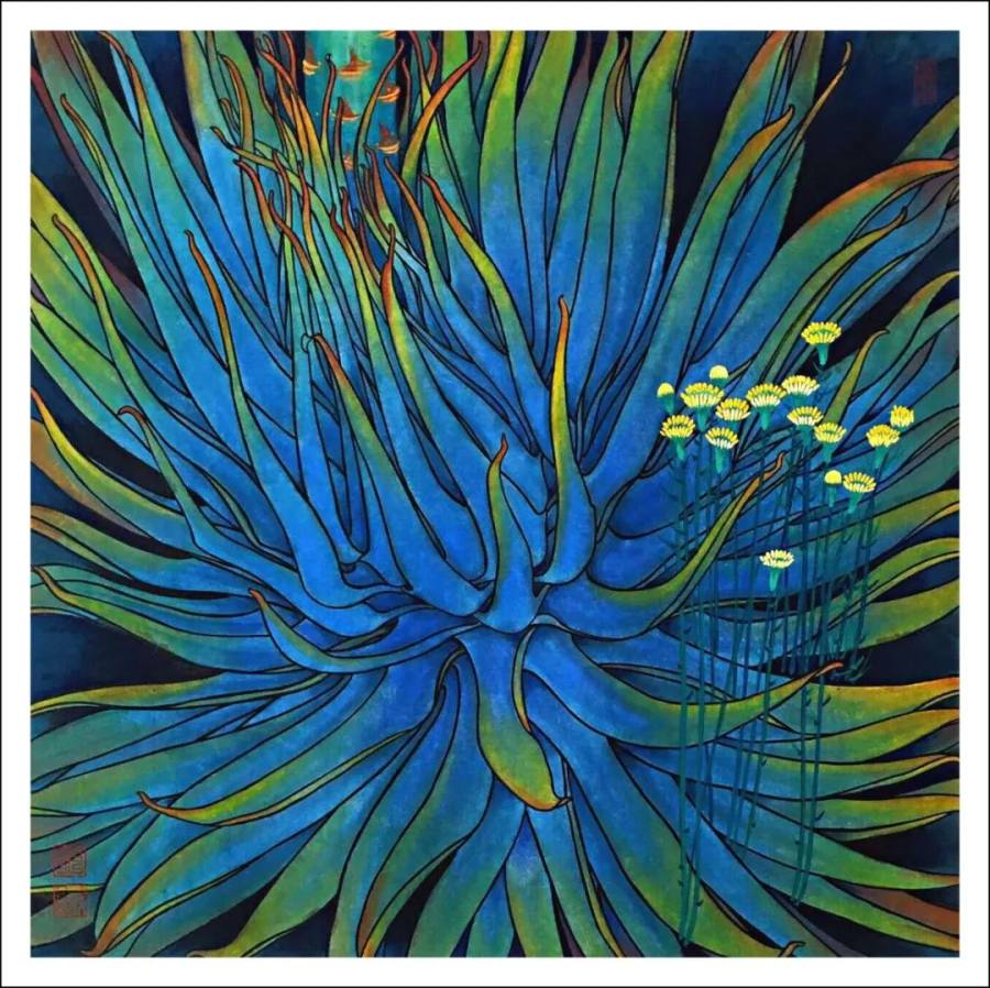 就比如说他的一幅《千禧之莲》,画中莲花首取盈动之姿,似绽放之初,含苞内敛。整朵莲花更是犹如油画那般,既追求于形质的真实厚重、也注重色调的准确渐变!但在画面背景中,王明科先生却是转用大写意的晕染效果,以深幽的蓝色作为主旋律,再融入少许的藻绿,使得整幅画面层次分明,渐次展开,与写实风格的莲花形成鲜明对比。最终在视觉上为观赏者带来一种循序渐进的空间纵深!可以说,无论是色彩语言,亦或是视觉审美,这些艺术手段都是为了实现王明科先生的创作初衷,那就是唤起观赏者内心深处的艺术共鸣,遂之激发无限联想……