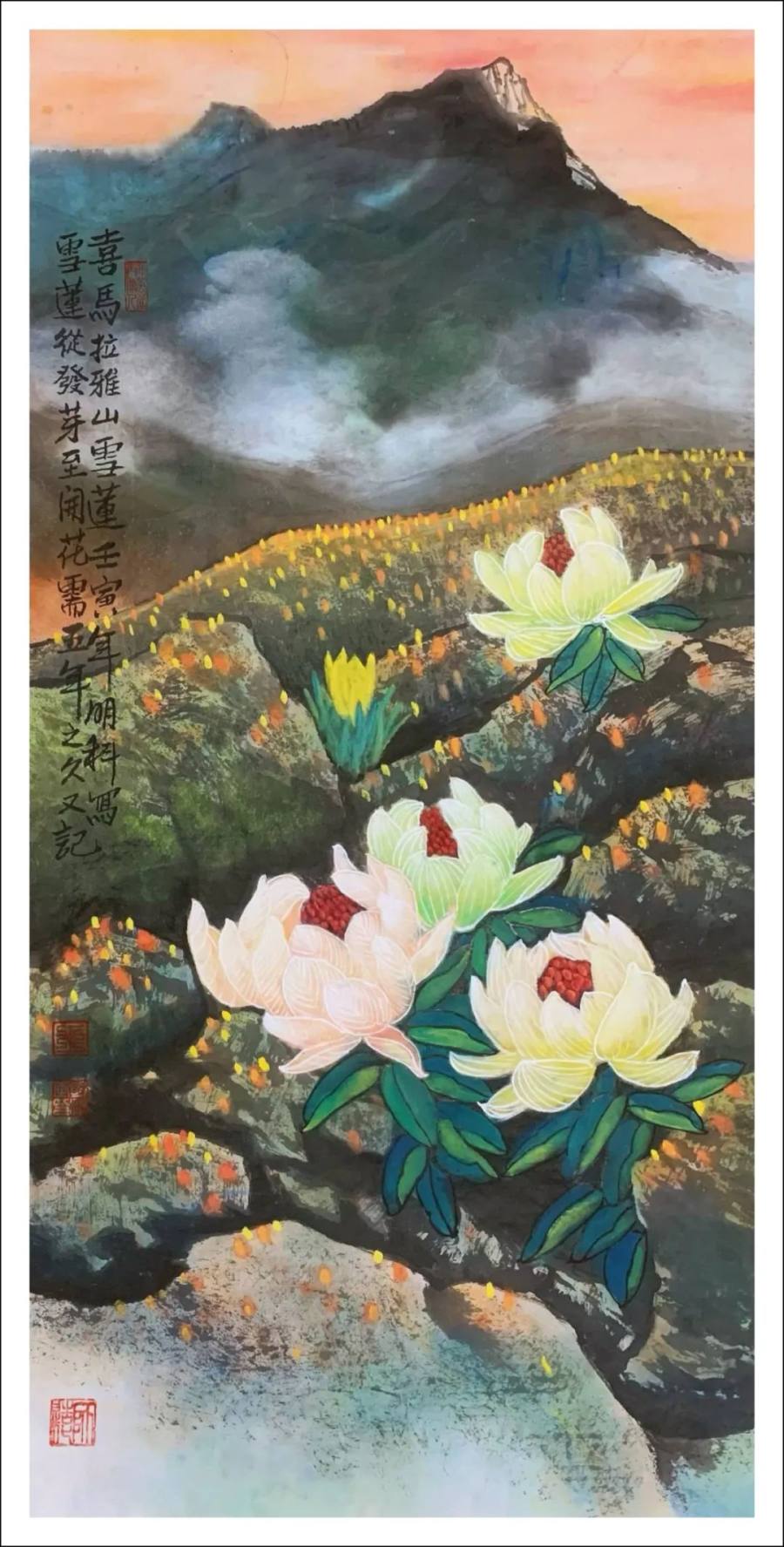 高山雪蓮 生宣工写彩墨 136X68㎝ 2022年 王明科