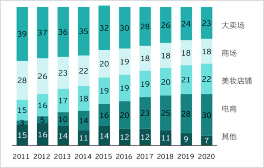 回顾中国化妆品市场渠道演变历程,2010年之前,线下CS专卖店、KA大型商超、百货专柜销售占比超过80%,呈现绝对主导地位。之后,随着电商渠道的迅速崛起,化妆品销售渠道结构发生了翻天覆地的变化。