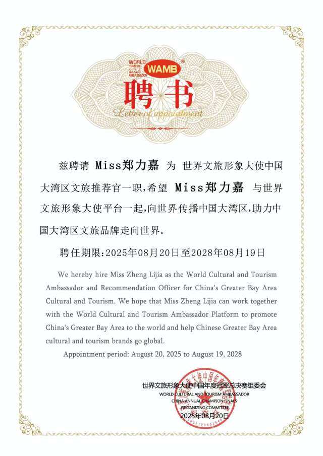 2025年8月20日,世界文旅形象大使中国广东书法推荐官、世界文旅形象大使中国广东舞蹈教学官、时尚网红郑力嘉(网名:书法舞者祖贤、深圳小祖贤、小祖贤),正式受聘为世界文旅形象大使中国大湾区文旅推荐官。