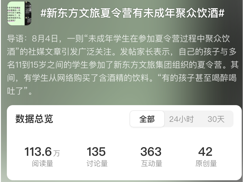然而,热浪之下,乱象环生。如果说高价收费、名不副实、质量参差不齐早已是研学游的“老大难”问题。那么,头部品牌口碑问题不断,则更是暴露研学游的种种风险。其中,八月初,一则社媒爆料就将新东方文旅推上风口浪尖:在由其组织的夏令营中,未成年学生聚众饮酒,部分学生“喝醉喝吐”。