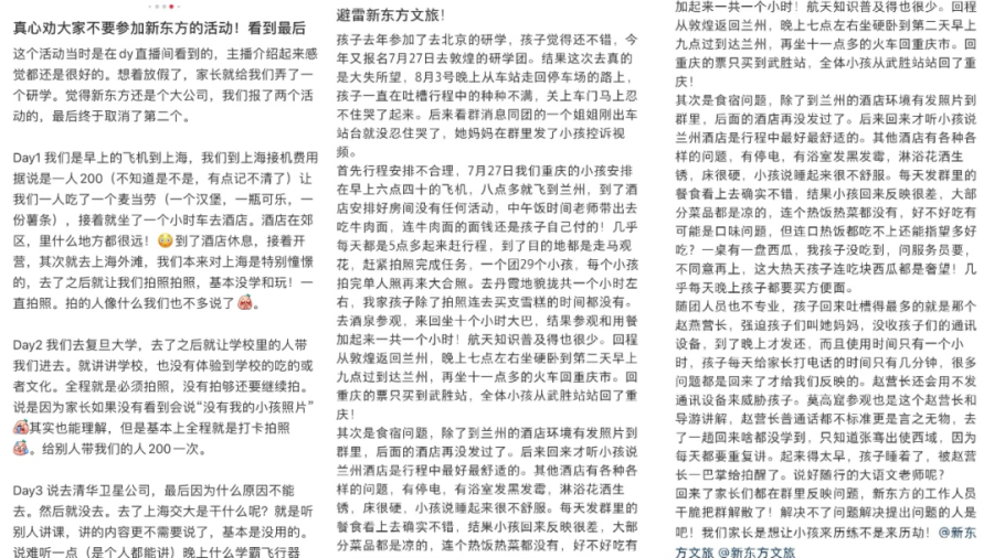 在社交平台上,有不少学生和家长曾吐槽新东方研学游的行程安排和日常吃住条件。其中,有学生提到自己参加的上海研学活动,“我们本来对上海是特别憧憬的,去了之后就让我们拍照拍照,基本没有学和玩,一直拍照。”而第二天去复旦大学的行程也以拍照为主,“没有体验到学校的吃的和文化,全程就是必须拍照。”