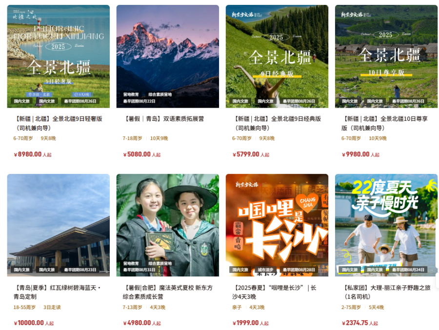目前,新东方文旅的产品体系中含有国内文旅、国际文旅、亲子文旅、国际游学、国内研学、营地教育6种产品。产品从69800每人的13天亲子北极圈之旅到99元每人的1日博物馆之旅,价格不一。