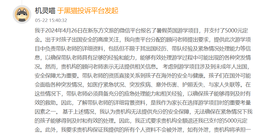 而在黑猫投诉上,也有消费者曾发起投诉,表示自己曾在新东方文旅的微信平台报名了暑假英国游学项目,出于对孩子出国安全的高度关注,向新东方分配的顾问老师提出要求,提供此次游学项目中负责带队老师的详细资料,包括但不限于其出国经历、带队经验及紧急情况处理能力等信息,以确保带队老师具有足够的经验和能力,能够有效处理游学过程中可能出现的各种突发情况。然而,贵机构的顾问老师表示无法提供相关信息。