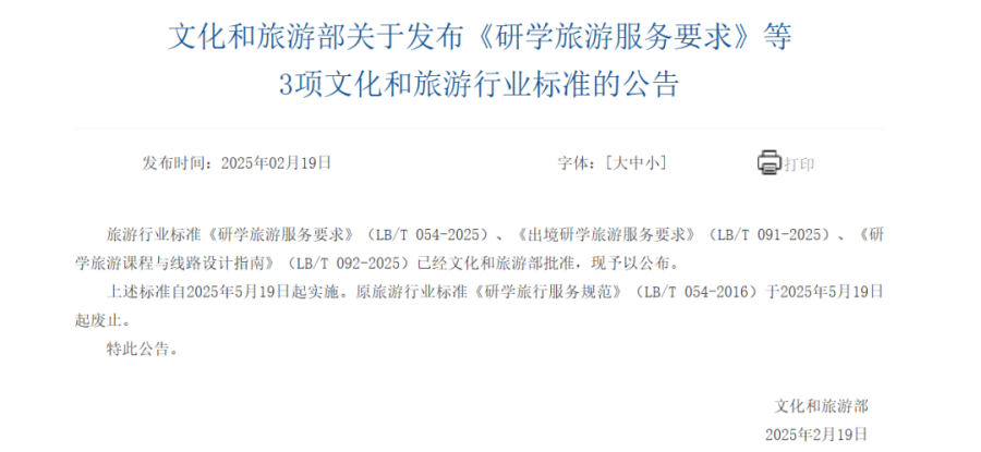 2025年5月,浙江牵头制定的《出境研学旅游服务要求》《研学旅游课程与线路设计指南》《在线旅游平台住宿预订服务规范》,经文化和旅游部批准正式发布,为行业高质量发展提供系统性规范支撑。其中,针对默认搭售、低价陷阱、大数据杀熟、订单退改难等突出问题,《在线旅游平台住宿预订服务规范》均提出了新的“解决方案”。《出境研学旅游服务要求》则首次设定强制性保障条款:经营者必须具备出境资质,建立境外供应商评估机制,优先选择获政府认证的课程供应商;研学指导人员需兼具教育背景、目的地文化熟知度及跨语言沟通能力;强制投保全球紧急救援险,单次事故赔偿限额不低于1000万元,人均赔偿限额超60万元;要求研学课程时长占境外行程50%以上,严禁虚假宣传,明示附加费用等等。