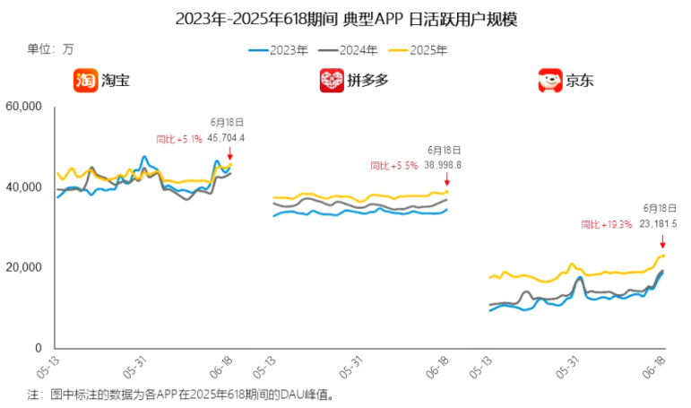 得益于此,外卖正在成为驱动用户活跃与平台增长的关键引擎。2025年618大促期间,淘宝日活跃用户同比增长5.1%,达到4570万;而京东因全面投入外卖的补贴竞争,日活用户同比大幅增长19.3%,攀升至2318万。