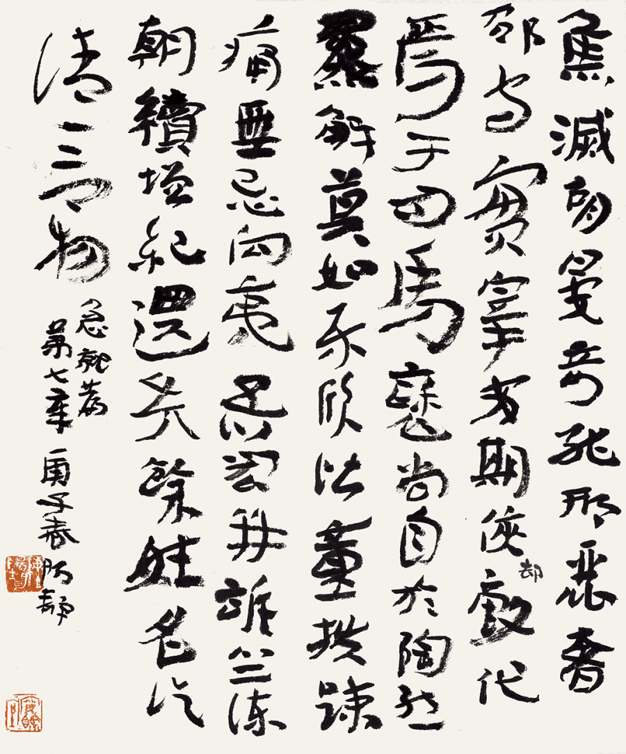 鲍贤伦近期创作似在谋求走出秦简樊篱,而开始进入一种自由综合探索的境地。因而面对其创作已很难确指其是秦简、汉隶,还是碑书。书家似在追求一种在综合日常自由书写所引致的对严整创作的超越。书家不想用一种创作概念来规范自己,而试图在创作上打破,重塑与自由挥洒,在一种下意识的有法中追寻无法的个性化书写。应该说,鲍贤伦在几十年的秦简、汉隶、简体小行书创作寻绎中完成了一种轮回与超越。他通过秦简超越了汉隶,又通过汉碑的典正朴茂转向简体小行书(内蕴碑隶与金农藁札意味)的自由烂漫。至此鲍贤伦从“我襟怀古”走向浪漫舒卷。陈阳静之于当代简牍创作的重要性则体现在,他对秦汉简牍多元审美风格的出色把握与对支撑简牍笔法的出众领悟与揭橥。这使他几乎可以自由地出入秦汉简牍多极风格而与古法相偕。同时,陈阳静对《急就章》文本的个性化诠释,凸显了汉简的草化旨趣,而将汉简与章草在创作观念上作了有效切分。随着陈阳静在汉简创作上所臻高度,紧承其后,他在创作上的进一步开启,则是汉晋笔法流变讨源中,由汉简下溯今草,实现“前帖学”的今草转换。这无疑是更具有挑战性的创作目标。