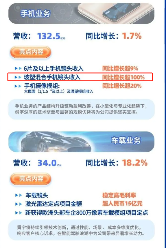 只是得益于在高端旗舰机型中参与度的提升,舜宇光学成功“以价补量”,上述两大品类的平均销售价格(ASP)均提高了约20.0%;整个上半年其手机相关产品总收入同比增1.6%至132.5亿元,成功稳住公司基本盘。