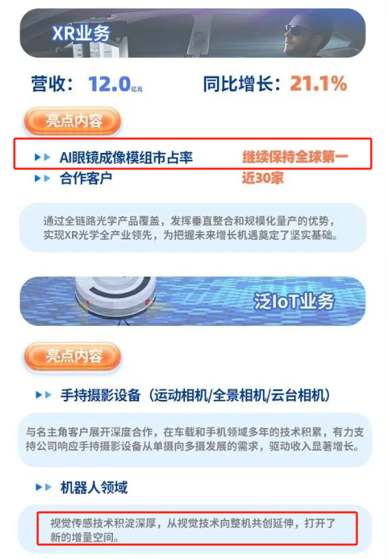 上半年,其XR相关产品继续扩张,实现收入12.01亿元,增长约21.1%。其中,增长快速的智能眼镜有望成为新的增长点,其相关成像模组在业内相对领先;至于已获得Meta、Pico等头部客户认证的AR光机产品,终端产品的普及速度慢于预期,短期内仍需“耐心等待”。
