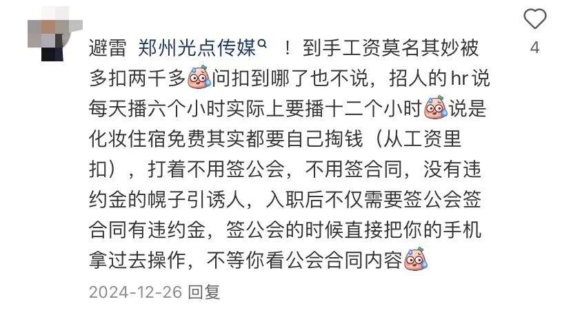 在小红书搜索“团播面试经历”,各种避雷帖随之映入眼帘。其中一条未按约定发放薪水的避雷帖下,有300多人回复,不少都在分享自己被“坑”的经历,包括欠薪、隐藏违约金等,月薪拿不满的不在少数。也有用户综合各种可能遇到的问题,总结十条“团播入行指南”。可见在高薪之下,乱象更甚。