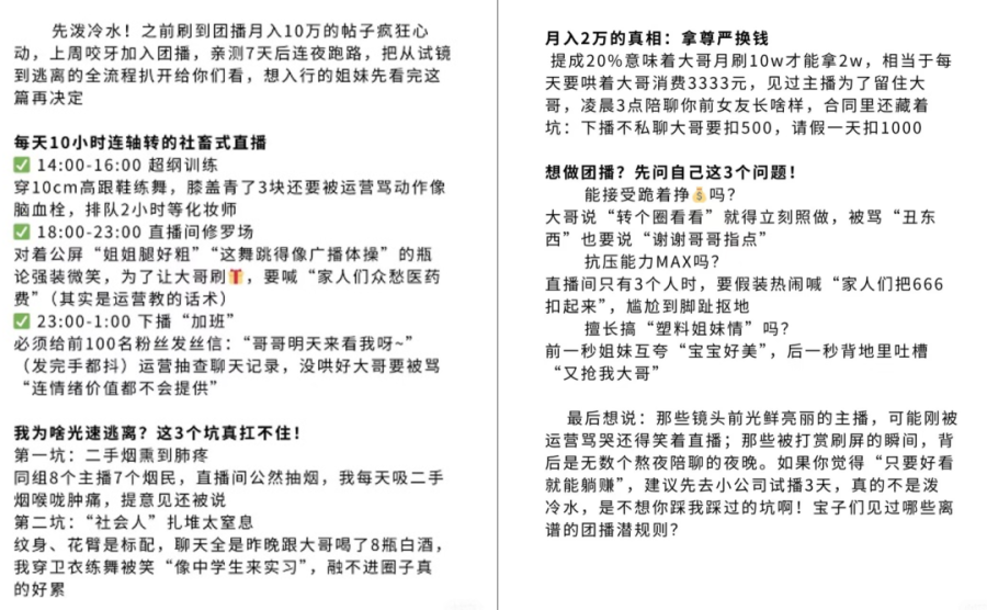 有小红书用户分享自己的团播经历时写道:“下播不私聊大哥要扣500”。换句话说,团播对主播的身体和精神消耗都非常大。