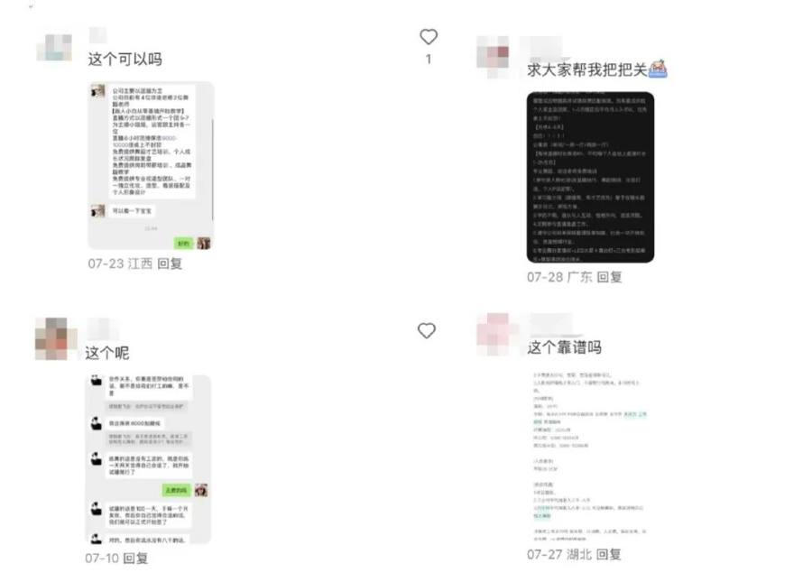 至少在眼下,一些有过团播经历的人,已经开始在社媒平台劝人不要轻易尝试,但在远高于平均工资的薪酬诱惑下,更多人还是抱着试一试的心态,在这类帖子下拿着跟hr的聊天记录询问:“博主看下我这个可以(相信)吗?”