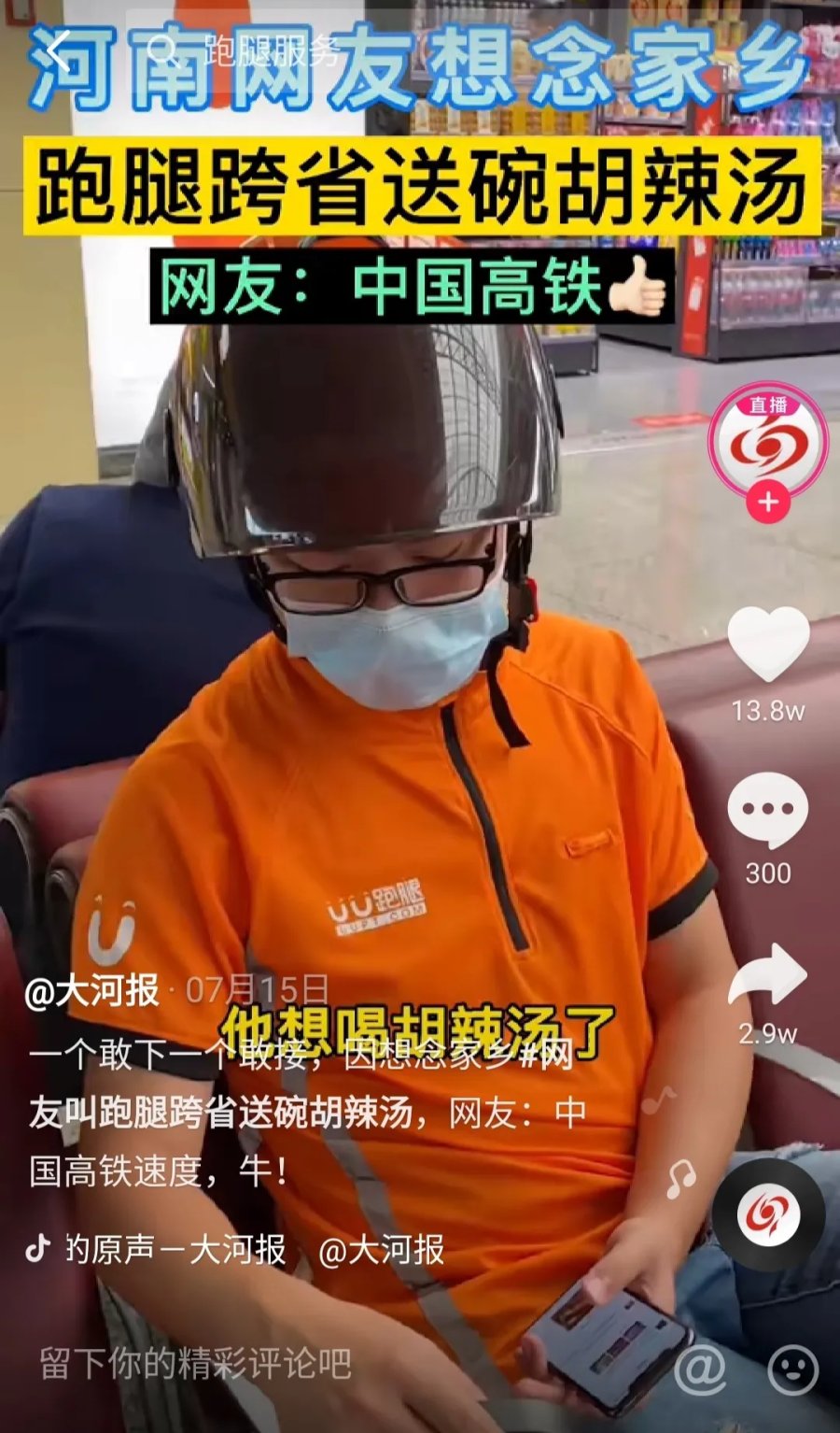 内容简单说就是,一位住在北京的河南老乡想家了,想吃老家的胡辣汤,于是便叫了一个UU跑腿,让他从河南郑州坐高铁送餐。