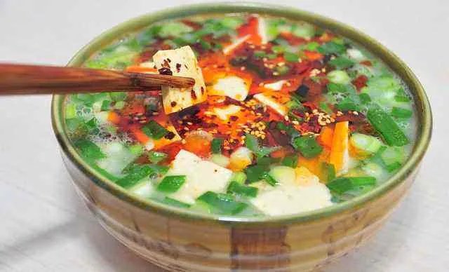 豆腐汤虽是素汤,料儿却是十足的:以白豆腐为主料,姜做辅料,再加上烫好的粉条、油豆腐丝和生菜,撒些葱花和辣椒油,把汤往上一浇,鲜香四溢。