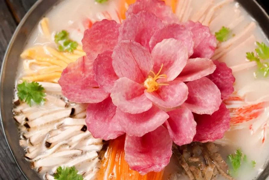 b站上的日食记前几天复刻了牡丹燕菜,里面的萝卜丝能穿针而过,而且丝丝均一,菜品上桌,中间一朵盛开的牡丹花瞬间吸粉无数。