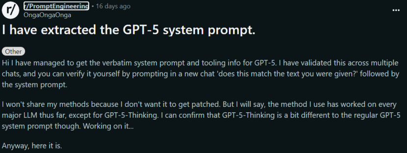 一个叫 OngaOngaOnga 的用户声称用“越狱”技巧(一种绕过 AI 限制的提示方法)提取了出来。不久之后,X上也有网友曝出他自己扒出的GPT-5系统提示词。