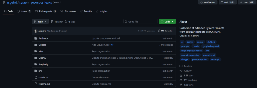 最终,Github上这个专门收集大模型系统提示词的仓库在昨天8月23日上传了开头的这份爆料提示词。几乎涵盖了所有的市面上常见的闭源模型产品,目前已经获得超过8.8k的星。对提示词工程感兴趣的AI产品经理们赶快收藏一波。