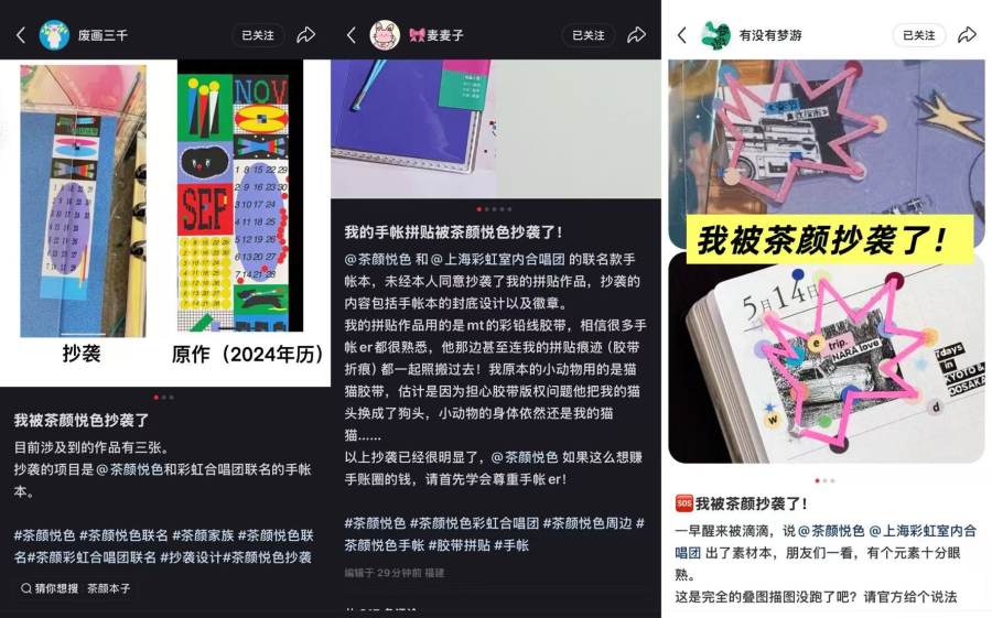 8月23日,博主“废画三千”、“麦麦子”和“有没有梦游”先后发帖称,茶颜悦色与上海彩虹室内合唱团新款联名手账本抄袭其作品,其中“废画三千”称目前涉及到抄袭的作品共有三张,“麦麦子”则表示,茶颜悦色在未经本人同意的情况下抄袭了她的拼贴作品,包括手账本的封底设计和徽章。博主“有没有梦游”称茶颜悦色手帐本部分元素与自己手帐素材高度相似。有网友调侃称,这款手帐本为“拼好本”。
