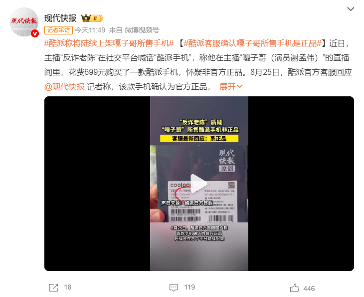 面对“反诈老陈”的质疑,谢孟伟在直播间作出了强硬回应,声称自己带货的所有产品都是正品。23日,反诈老陈再次喊话酷派官方,希望他们作出正面回应,以维护消费者合法权益。